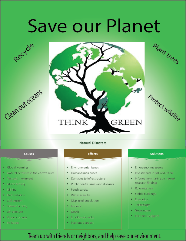 This poster was created in Illustrator. I used gradient with the colors white and light green. Did some research and found two images that really represented the poster very well. I typed in some side notes to tell people what has to be done to fix our planet.